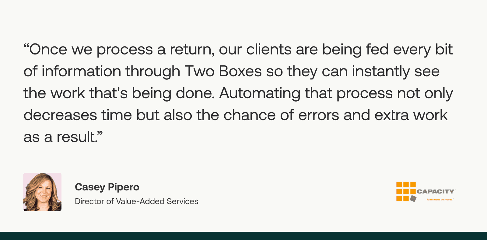 With Two Boxes, Capacity has quickly scaled up their returns processing thanks to fewer manual steps. Up-to-date data ensures they stay ahead of higher volumes of returned items and keeps clients informed about their reverse fulfillment.
