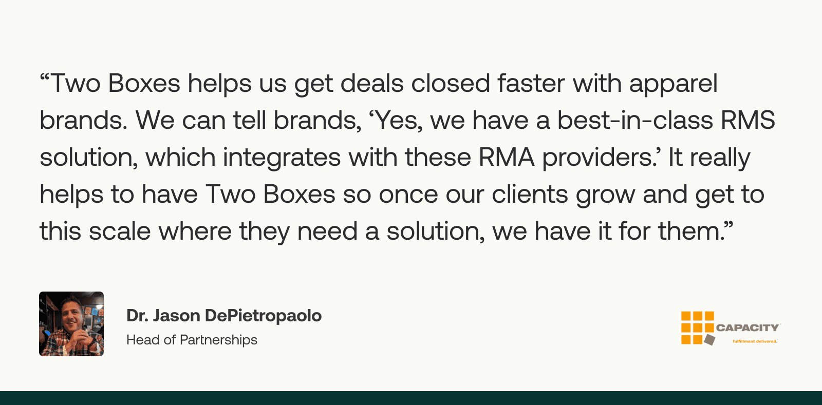 By leveraging Two Boxes, Capacity has transformed returns into a key benefit, boosting their reputation as a reliable 3PL for apparel brands of all sizes.