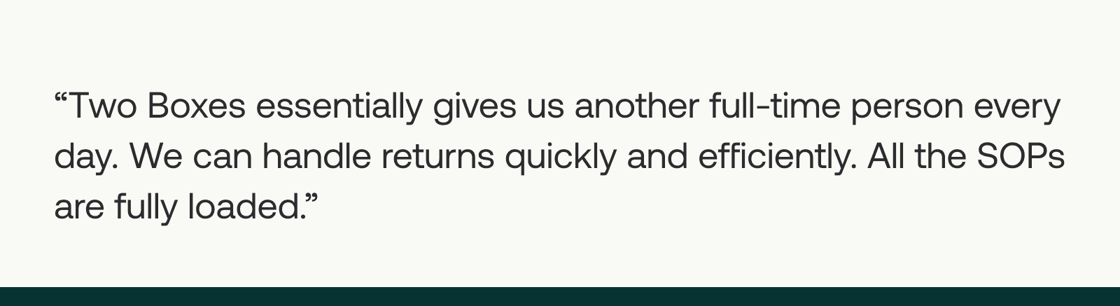 At Two Boxes, our mission is to make returns an asset instead of a liability. We’re proud to partner with 3PLs like Stord, Barrett, & Jay Group to supercharge returns operations. If you’d like to make returns a strength for your business, reach out to us today!