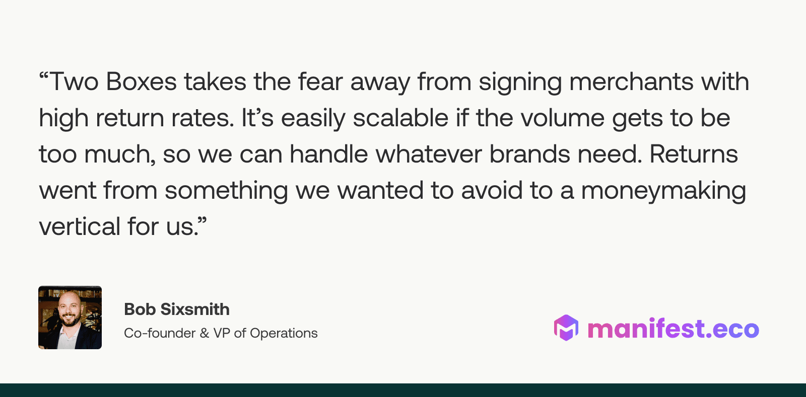 Partnering with Two Boxes turned Manifest.eco's reverse fulfillment into a strength that sets them apart. Now, they're building upon their track record of sustainable fulfillment with scalable, easy-to-manage returns.